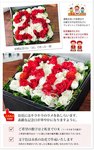 - ご希望の数字は2桁までOK(1~99までの数字) ご希望の数字は「ギフト設定」のギフトメッセージ欄にお書き添え下さいませ。文字色は赤系のお花で作成いたします。花色のご希望がございましたら事前にお問い合わせ下さいませ。