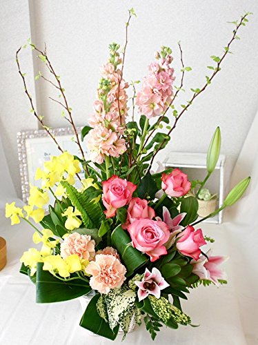 - とても大切な方のお誕生日や開店・新築お祝い、法人へ贈るのにふさわしい華やかで上品な生花フラワーアレンジメントです。より豪華に見えるように、背の高いお花を使ってデザインいたします。全体のお花の長さを長くすることによって華やかで上品な雰囲気になります。フォーマルなデザインなので、法人ギフトや舞台祝い、展覧会のお祝い、発表会の贈り物や還暦のお祝いなどの長寿祝いなど、あらたまった席や特別な日のお祝いにぴったりです。