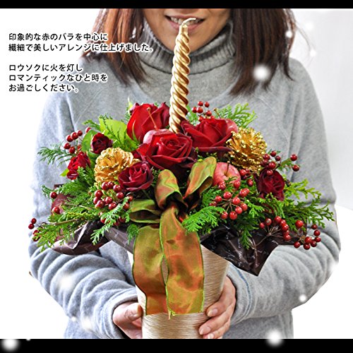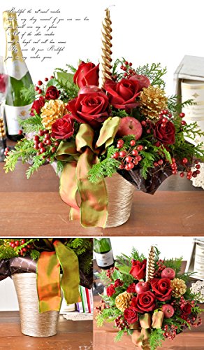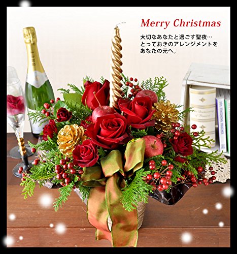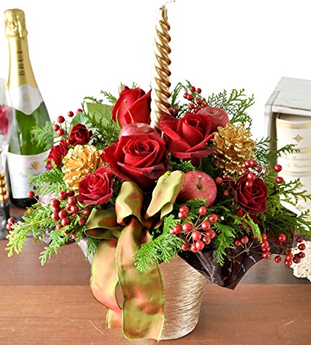 - 大切なあなたと過ごす聖夜…。とっておきのアレンジメントをあなたの元へ。クリスマス限定のゴージャスなアレンジメントです。ゴールドのフラワーベースにクリスマスの赤、赤バラをアレンジしました。また、赤いリンゴがアレンジのポイント。ロウソクに灯をともしてロマンティックなひとときをお過ごしください。テーブルにも飾っていただけるサイズです。