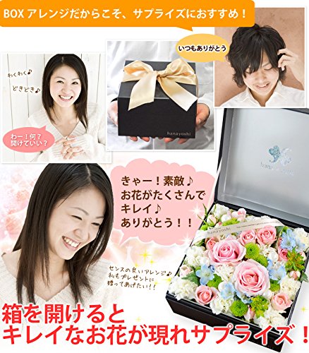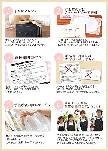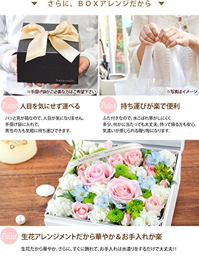 - 【サイズ】約:横17×奥行17×高さ10cm 【内容】生花アレンジ:季節の花各種/グリーン/花由オリジナルBOX/吸水性スポンジ/リボン/ご希望の方にメッセージカード、手提げ袋/お取扱説明書