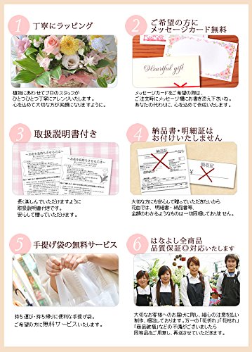 - ●ギフトとしてお贈りする場合、【生花を使用する商品】は、先様にできるだけ新鮮で美しい状態でお受け取りいただくために、【前もってご都合の良い日程をご確認いただく】か、【事前にお贈りする旨のご連絡】をされましてからの配送日・時間帯のご指定をお願いいたします。●ご不在の場合の保管期間は、新鮮な状態でお届けするためにも、お届け日を含めて3日間とさせていただきます。先様と連絡がとれず、ご不在のため期間中に再配達ができない場合も返品・交換を承ることはできません。また生花・植物につき返金もいたしかねますので、予めご了承ください。