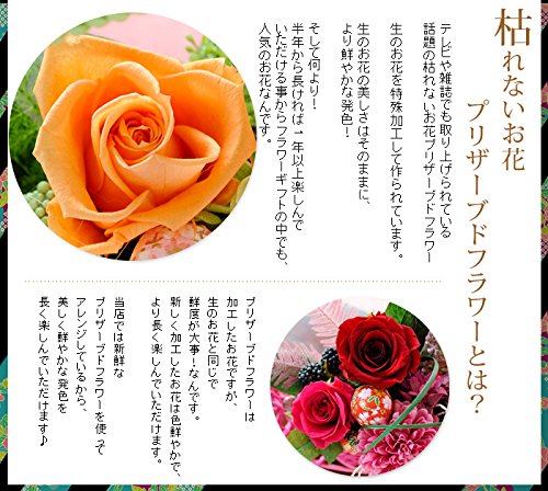 - 話題の枯れない花 プリザーブドフラワーは生のお花を特殊加工して作られています。生のお花の美しさはそのままに、より鮮やかな発色。そして長ければ、半年から1年以上楽しんでいただけます。こちらの「花あかり」は、そんなプリザーブドフラワーを和風にアレンジしました。プリザーブドフラワーのバラやアジサイがお部屋や玄関を華やかに彩ります。お誕生日プレゼントや記念日のお祝い、お見舞い、古希や喜寿など長寿のお祝い、ご新築祝いなど様々な場面でのフラワーギフトとしておすすめです。