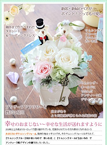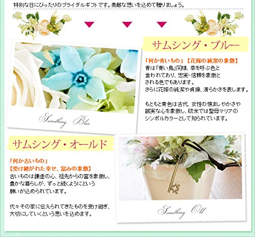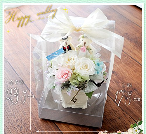 - 【サイズ】本体:(約)□11×高17cm クリアケース:(約)□17.5×高23.5cm 【内容】プリザーブドフラワーローズ・ジャスミン・ブルースター・アジサイ/ プリザーブドグリーン/リボン/ピック/その他アートグリーン/ブライダルベア(新郎・新婦)/ビンテージアクセサリー鍵/レースペーパー/クリアケース/リボン/タグ/お取り扱い説明書/品質保証付ショップカード