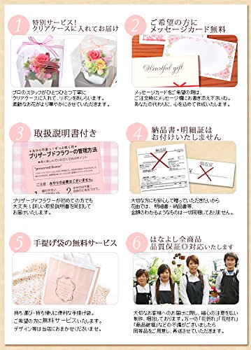 - プリザーブドフラワーは生花を特殊加工し、美しさはそのままに、より鮮やかな発色を楽しめる枯れないお花です。当店では新鮮なプリザーブドフラワーを使ってアレンジしていますので、美しく鮮やかな発色を長く楽しんでいただけます。