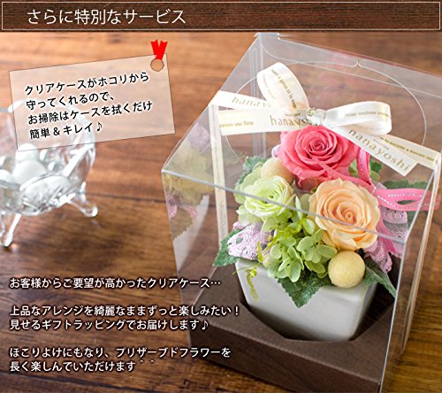 - 【サイズ】アレンジメント:(約)横10×奥行き10×高さ12cm クリアケース:(約)口12×高さ16cm 【内容】プリザーブドローズ/プリザーブドカーネーション/フェイクグリーン/ペリーピック・アート実物など/フラワーベース(陶器)/クリアケース/リボン/当店オリジナル母の日カード/取扱説明書/品質保証付きショップカード /※オリジナル母の日カードの文面は「Happy Mother's Day! 日頃の感謝の気持ちをこめて おかあさん いつもありがとう」になります。