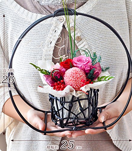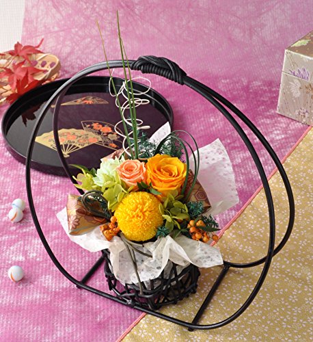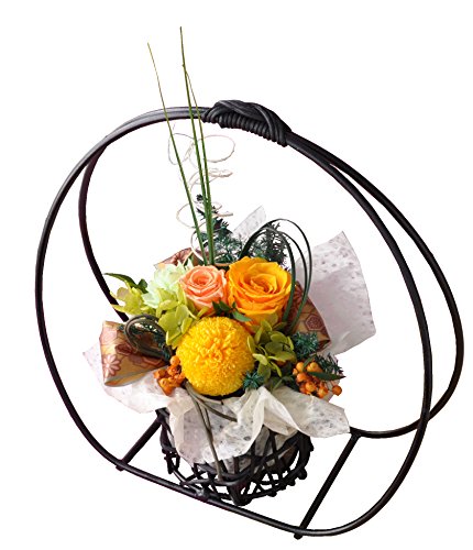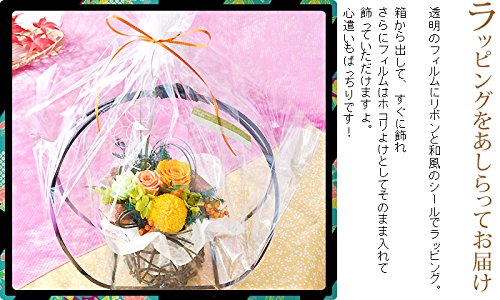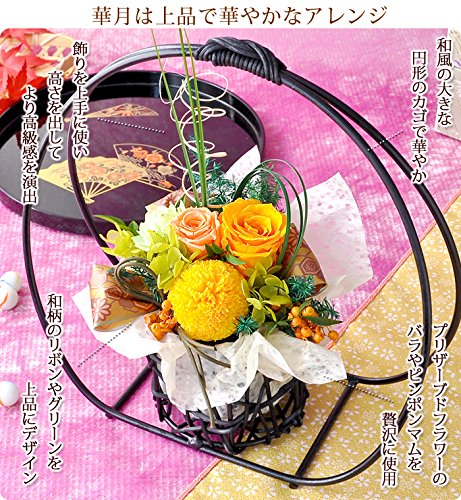 - プリザーブドフラワーは生花を特殊加工し、美しさはそのままに、より鮮やかな発色を楽しめる枯れないお花です。半年から長ければ1年以上お楽しみいただけます。フラワーギフトの中でも、人気のお花です。プリザーブドフラワーは生のお花と同じで鮮度が大事です。当店では新鮮なプリザーブドフラワーを使ってアレンジしていますので、美しく鮮やかな発色を長く楽しんでいただけます。「華月-kagetsu」は上品で華やかなアレンジ。和風の大きな円形のカゴで華やか。飾りを上手に使い、高さを出してより高級感を演出。プリザーブドフラワーのバラやピンポンマムを贅沢に使用。和柄のリボンやグリーンを上品にデザイン。