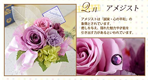 - 誕生石のスワロフスキーをあしらったプリザーブドフラワーです。2月の誕生石はアメジスト。「誠実・心の平和」の象徴とされています。癒しを与え、隠れた魅力や才能を引き出す力があるといわれています。