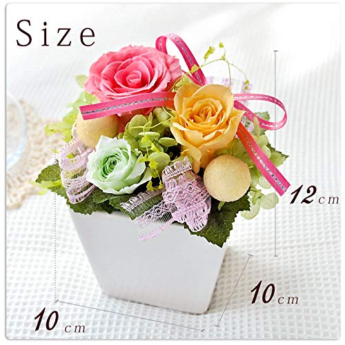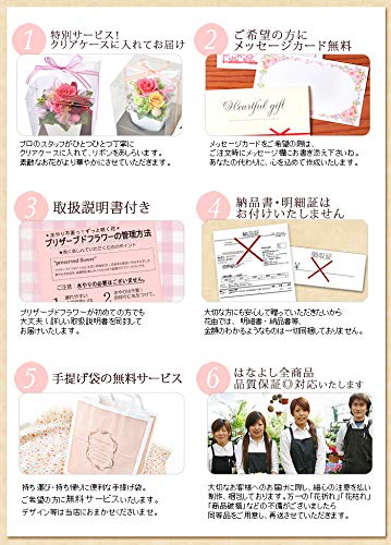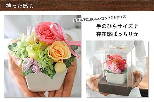 - クリアケースがホコリから守ってくれるので、お掃除はケースを拭くだけ簡単&キレイ。プリザーブドフラワーは生花を特殊加工し、美しさはそのままに、より鮮やかな発色を楽しめる枯れないお花です。半年から長ければ1年以上お楽しみいただけます。