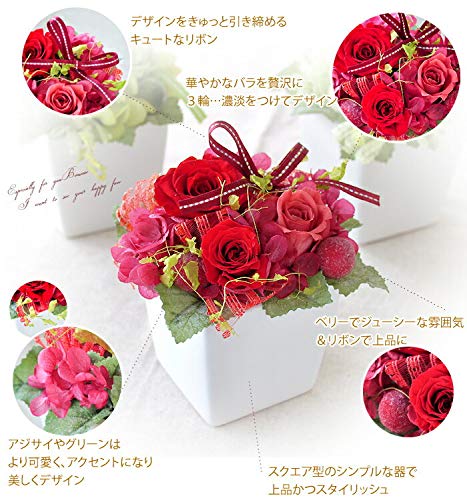 - 【アレンジの内容】花材:プリザーブドローズ/プリザーブドアジサイ/フェイクグリーン/ペリーピック・アート実物など/フラワーベース(ブリキポット)/リボン/お取り扱い説明書/ ※ブリキポットについては、傷や塗装のムラなどがある場合がございます。何卒ご了承下さいませ。 クリアケースに入れてお届け(デザインは当店におまかせください)/ご希望の方にはメッセージカード・手提げ袋 (ギフト設定よりご指定くださいませ)