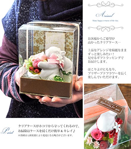 - 陶器のアニマルにプリザーブドフラワーをアレンジしました。とても華やかなアレンジで、贈り物としても喜ばれる一品です。誕生日プレゼントはもちろん、結婚祝い、記念日、長寿お祝い、退職祝い、入学・就職祝いなど、様々なお祝いの場面でも喜ばれそうなプリザードフラワーです。アニマル型の陶器はかわいいだけでなく、高級感があります。