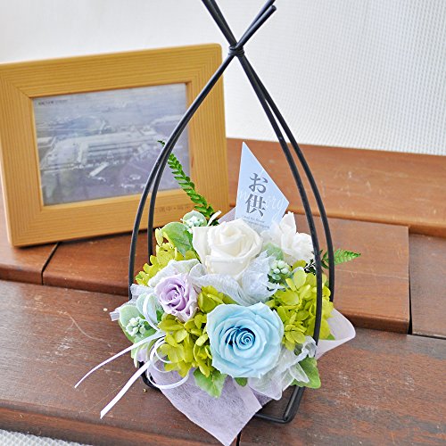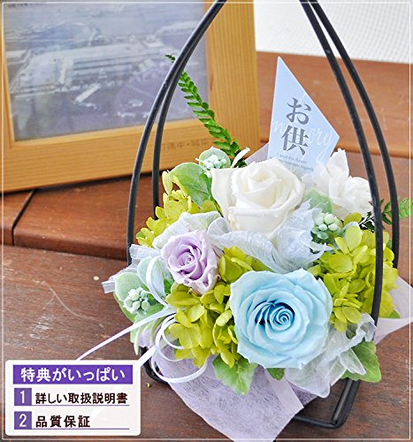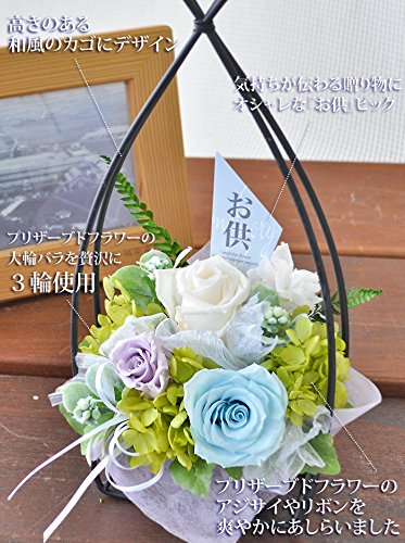 - お供え用のプリザーブドフラワーです。お盆のお供えやお仏壇用の仏花として、ご利用いただけます。休みが取れずにお盆に帰れない方や遠くへお届けしたい方、もちろんご自宅用としてもおすすめです。高さのある和風かごにアレンジし、プリザーブドフラワーの大輪バラを贅沢に3輪使用し、プリザーブドアジサイやリボンを贅沢にあしらいました。「お供ピック」をつけてお届けします。