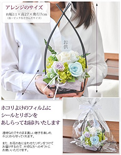 - 【アレンジ全体のサイズ】(約)幅11cm×高27cm×奥行7cm 【内容】プリザーブドフラワーローズ/プリザーブドフラワーカーネーション/ プリザーブドフラワーアジサイ/プリザーブドグリーン/ベリーピック/お供えピック/器/リボン/ご希望の方にはメッセージカード(お客様がご記入できる欄にお書き添えくださいませ)