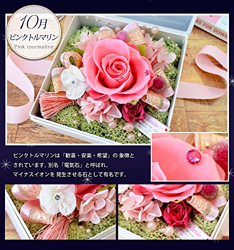 - お誕生日プレゼントやお祝いにぴったり!人気のボックスフラワーの誕生石verです。10月の誕生石は「ピンクトルマリン」。ピンクトルマリンは「歓喜・安楽・希望」の象徴とされています。別名「電気石」とも呼ばれ、マイナスイオンを発生させる石として有名です。