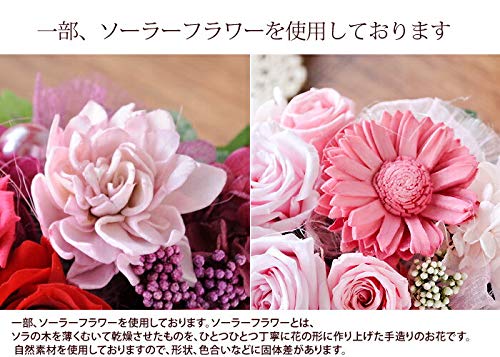 - 一部、ソーラーフラワーを使用しております。ソラの木を薄くむいて乾燥させたものを、ひとつひとつ丁寧に花の形に作り上げた手造りのお花です。 自然素材を使用しておりますので、形状、色合いなどに固体差があります。