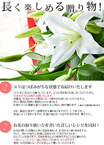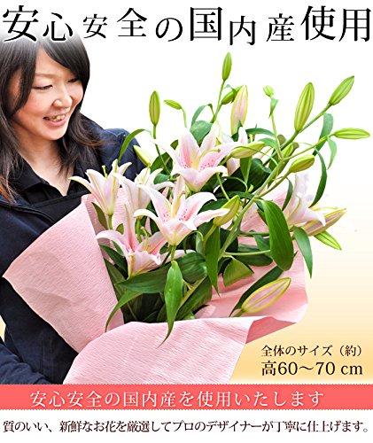 - 【サイズ】(約)高さ約60cm~70cm *大きさは目安となります *デザインにより多少異なります 【内容】ユリの花束:ユリ5本(4輪~5輪)/切り花活力剤/ご希望の方にメッセージカード、ラッピング(無料。ご購入時に「ギフトの設定」よりご用命ください)/お取扱説明書/品質保証付ショップカード *請求書・納品書などの金額が分かる明細は同梱しておりません