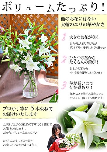 - ボリュームたっぷり 華やかな大輪のユリをプロが丁寧に5本束ねてお届けいたします。つぼみがちな状態で出荷いたしますので、お花が咲き誇るまで長くお楽しみ頂けます 。