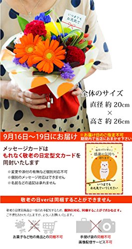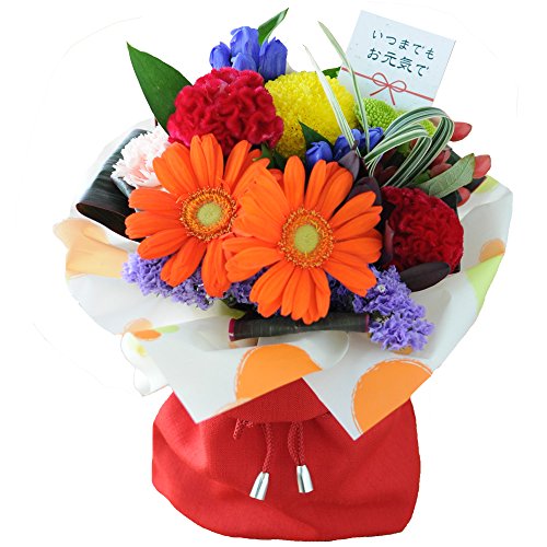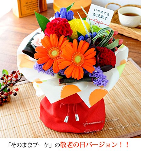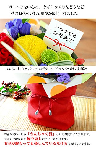 - 当店大人気のそのまま飾れる花束「そのままブーケ」の敬老の日verです。ガーベラを中心に、ケイロウや敬老の日のフラワーギフトとして人気のお花「りんどう」など、秋のお花をいれて、和風に華やかに仕上げました。お花には「いつまでもお元気で」のピックを付けてお届けします。お花が終わった後は、お花を入れておりますきんちゃく袋は、普段使いにご利用いただけます。布製の生地ですので、繰り返しお使いいただけます。