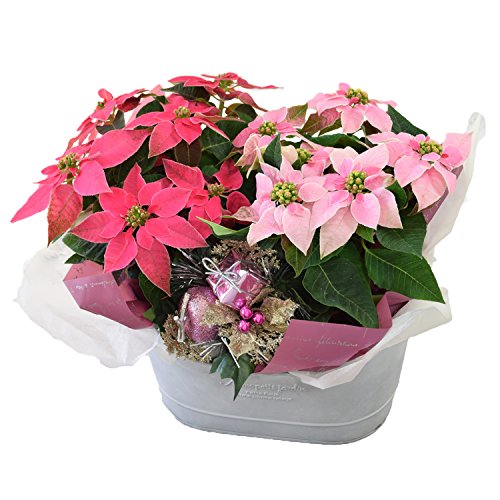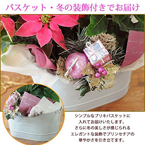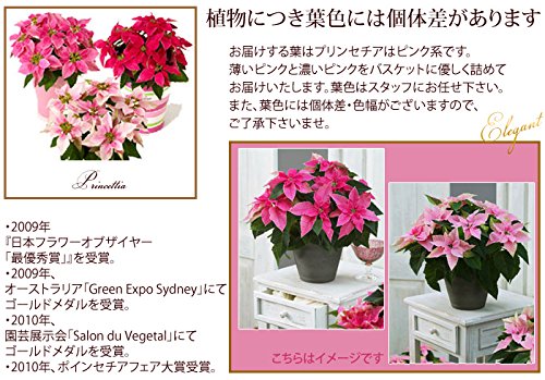 - 2009年「日本フラワーオブザイヤー」など数々の賞を受賞してきたサントリーフラワーズのプリンセチアは、"プリンセス"のような華やかな印象と"ポインセチア"を組み合わせて 「プリンセチア」と名づけられました。そんなプリンセチアをおしゃれでシンプルなブリキバスケットに寄せ入れして、お届けいたします。さらに冬の美しさを感じられるエレガントな装飾で、プリンセチアの華やかさを引き立てます。