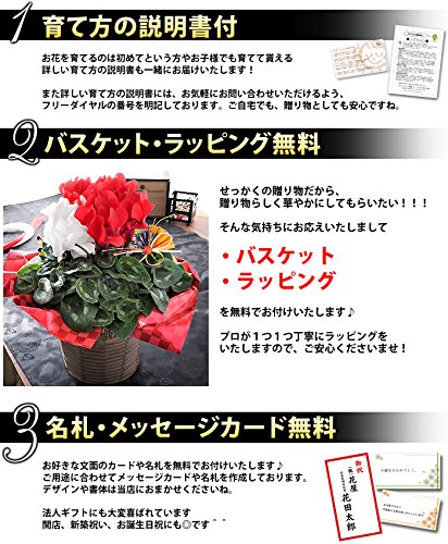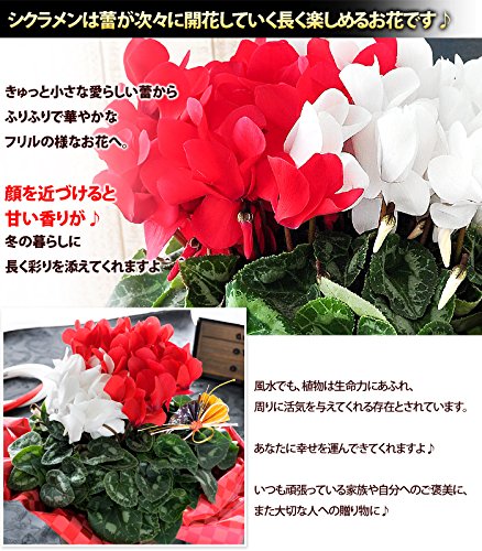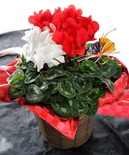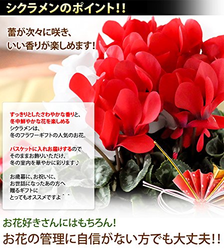 - 【サイズ】直径約25cm×高さ約35cm(植物に付き大きさは目安となります。バスケットを含むサイズ) 【内容】紅白シクラメン5号/扇ピック/バスケット(デザインは当店におまかせください)/ラッピング/育て方説明書/品質保証付ショップカード/ご希望の方に名札またはメッセージカード *資材は入荷状況により一部変更となる場合がございます。ご了承くださいませ。