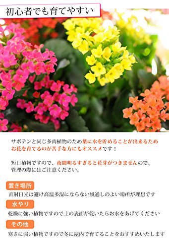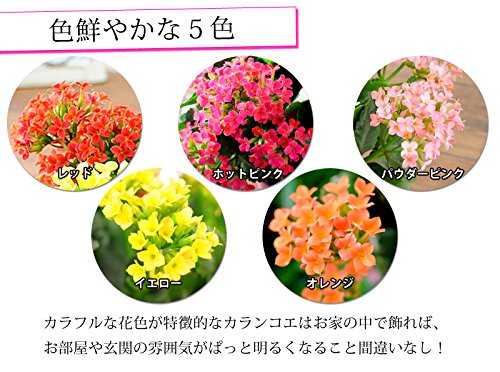 - 花言葉は「幸福を告げる」「おおらかな心」。お花がかわいいカランコエ。かわいいながらも丈夫な植物なので、人気のお花のひとつです。色鮮やかな「レッド」「ホットピンク」「パウダーピンク」「イエロー」「オレンジ」の5色が咲いています。6号サイズの花鉢なのでボリュームもたっぷりなお花です。