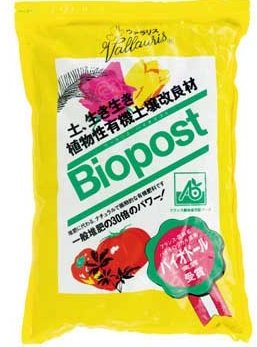古い土を何度でも肥沃な土に再生 一般堆肥の30倍の肥料効果で、土が固まらず根詰まりも起こしません。 フランス・パスツール研究所の協力を得て50年以上前に開発された、長い歴史を持つ完全植物性有機土壌改良材です。微生物資材として非常に安定した効果で1g中に27億以上の微生物を含んでおり、50年以上の経験と実地検査により自然の生態系を壊さない安全性が実証され、フランスの有機農法の最高賞「バイオドール金賞」を受賞しました。有機農法の品質基準に応える製品として家庭園芸・農業・砂漠の緑地化など、世界中の幅広い場所で使用されています。土壌改良剤とは違い、100%植物性の有機物を使用したもので、化学的な物は一切入っていないため、環境にも非常に優しい商品です。プロの園芸家から園芸を始めたばかりの初心者まで、全ての植物に使用でき簡単に園芸を楽しめる商品であり、バラ・蘭・ハーブ・野菜・果物、どのような植物にもお使いいただけます。※バイオドール金賞とはフランス農務省が50年以上にわたり自然の生態系を壊さない安全性を認定した有機農法の最高賞です。バイオポストは「バイオドール金賞」を受賞した唯一の土壌改良材です。