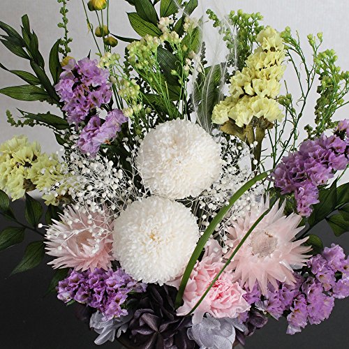 - ・花材:ピンポンマム・スターチス・カーネーション・シルバーデージー・カスミソウ・リンフラワー・モリソニア・フエザーグラス・ラスカル・ストーベ・ベアグラス