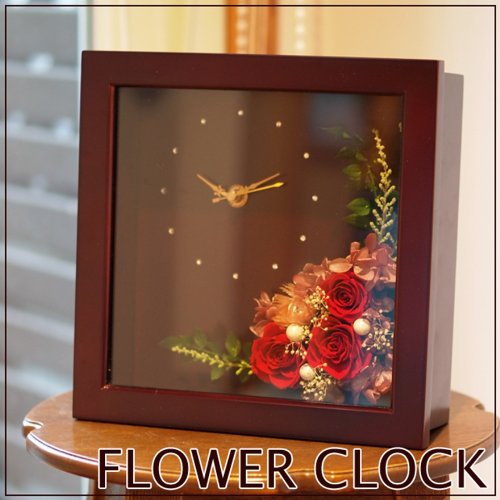 fleurcocoオリジナル フラワー時計 ブラウン 枯れないお花のプリザーブドフラワー【フラワーギフト】 レッド系 結婚祝い ギフト 還暦祝い プレゼント 新築祝 引越祝 開店祝 開院祝 誕生日