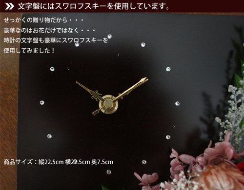- お洒落なブラウンボックスに、華やかなプリザーブドフラワーとキラキラ輝く文字盤のスワロフスキーが豪華さを演出いたします。