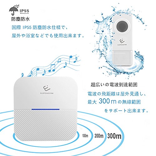 ワイヤレスチャイム ELEPOWSTAR ドアホン 玄関チャイム 呼び出しチャイムセット 最大300m無線範囲/日本語取扱書/防水仕様/52曲選択可/音量4段階調節/LEDライト点滅 (B6送信機1受信機1)
