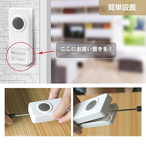 - ♥【簡単使用&52曲音楽選択】♥無線で配線工事が不要です。電池式なのでどこでも設置できます。受信機はコンセントに差し込み、発信機は付属の両面テープ或いはねじでお好きな場所に固定できます。呼出音楽は52メロディーを選択可能です。受信音量は4段階あります。お好みに合わせて選択できます。