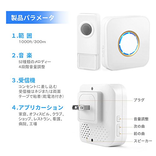- ♥【52種類のメロディーと4段階の音量&広い使用場所】呼出音楽は52メロディーを選択可能です。受信音量は4段階あります。お好みに合わせて選択できます。玄関チャイム、ナースコール、介護現場やレストラン、倉庫などでの呼び出しチャイムとして設置できます。自宅、事務所、工場、介護現場、店舗、レストラン、居酒屋などにも最適です。