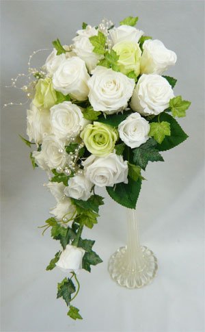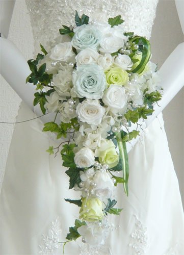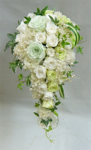 プリザーブドフラワーブーケ/ 白・淡グリーン パールキャスケード ウエディングブーケ