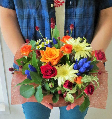 - 旬の赤・オレンジや黄色のお花を取り合わせ元気な色合いで仕上げます。