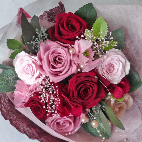 - 長さ:約25cm(花束タイプ)花材:バラ/プリザーブドフラワー 葉・パール/アート