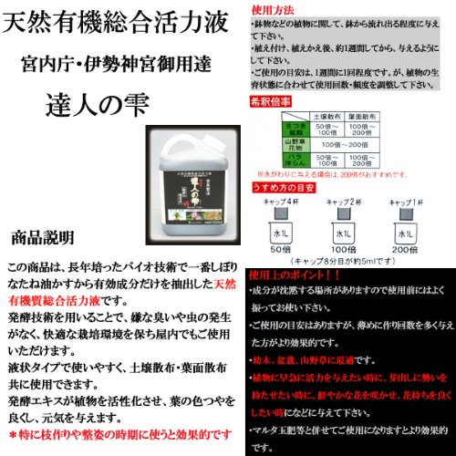 バイオ技術で一番絞り菜種油粕から有効成分だけを抽出した天然有機質総合活力液です。 嫌な臭いや虫の発生が無く、土壌散布・葉面散布が可能です。