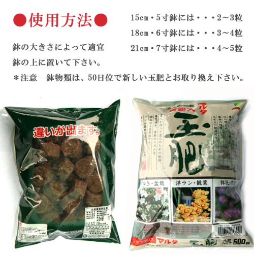 鉢物にお使いの場合50日ぐらいで新しい玉肥とお取替え下さい。