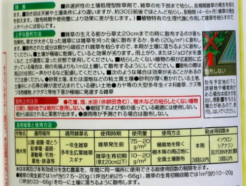 ●パラパラまくだけで、約6ヶ月間効き目が持続! ●枯れ始めが早く、スギナの根まで枯らす! ●一年生・多年生広葉雑草に使える!