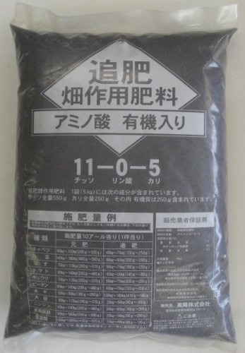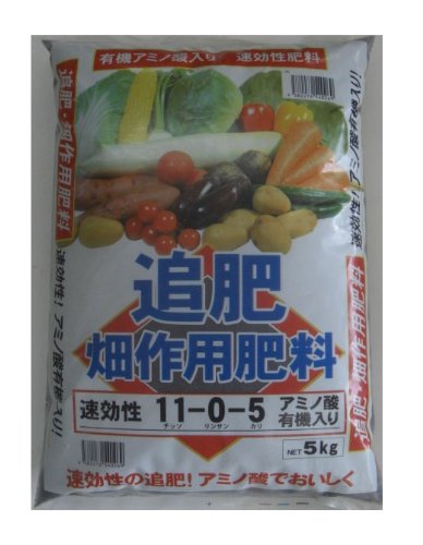 ●【用途】園芸用肥料。●【機能・特徴】追肥畑作用肥料1袋(5kg)には、チッソ全量550g、カリ全量250g、その内有機質は250g含まれています。【注意事項】当商品は追肥設計の肥料ですが、もし元肥としてもご使用になる際は、パッケージの詳細をお読みください。詳しい使い方に関しては、農業普及指導センター等に御相談下さい。