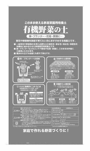 ●【用途】園芸用培養土。●【機能・特徴】草花や野菜類を育てたい方にお勧めする培養土です。一般草花や野菜類の生育に必要な土の通気性、排水性、保水性、保肥性を効果的に組み合わせた家庭園芸菜園用培養土です。鉢・プランターなどのコンテナ栽培や花壇・菜園に、このままお手軽にご使用できます。種まきの土にも幼苗にも使えて安心です。【注意事項】お子様の手の届かない所に保管してください。食品ではありませんので幼児が誤って食べないようご注意ください。直接手で触れると皮膚が荒れる場合があります。使用に際しては手袋をはめるか、シャベル等を使って下さい。保管中にカビが発生したり、変色しても品質に影響ありません。開封後はなるべく乾燥した場所に保管してください。