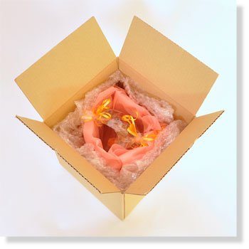 ひとつひとつ丁寧にラッピングしたプリザーブドフラワーを、緩衝材でしっかり固定して安全にお客様の元へお届けいたします。