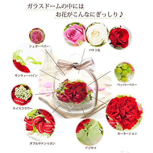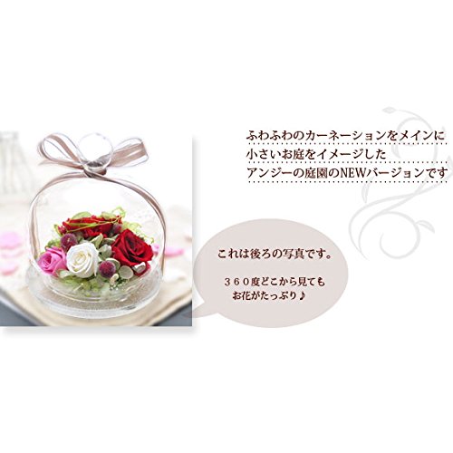 - ◆ 商品の特徴 ◆ 「アンジーの庭」~ お手入れ不要、枯れないお花 ~ カーネーション1つとバラ3つをあしらった、豪華なプリザーブドフラワーのアレンジメントです。かわいいガラスケース入りなので、ホコリがつく心配もありません。生花に特殊加工を施し、長期保存を可能にしました。