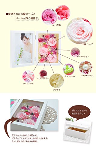 枯れないお花を敷き詰めたプリザーブドアレンジとフォトフレームが一体となったアイテム