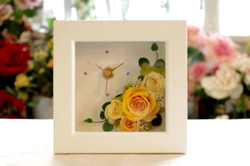 - ■サイズ:14×14×6(cm) ■素材:プリザーブドローズ、かすみ草、アジサイ、パールピック、アートワイヤープランツ、フレームの時計(MDF)