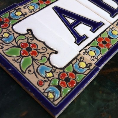 モザイクのデザインと色合いが鮮やかな、スペイン製のタイル表札。