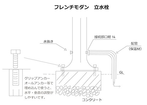 - 付属のビスで地面に固定いただけます。 ・使いたいところに移動できる立水栓 ・ビスで固定すれば常設使用も ・フレンチモダンなおしゃれなデザイン ・タンク内の水は夏季限定ですが、太陽熱により 温かくなります。 ※寒冷地不可
