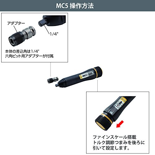 ●【用途】ナット・ボルト等の締めつけ、緩め作業。●【機能・特長】グリップ下部のファインスケールでは更に細かいトルク値の設定や確認が行えます。滑りにくく高トルクをかけられる握りやすいグリップです。取り正確なトルク設定が可能なファインスケール搭載です。自転車パーツや電機部品の組立・修理に最適です。六角ビット用アダプターが付属しています。