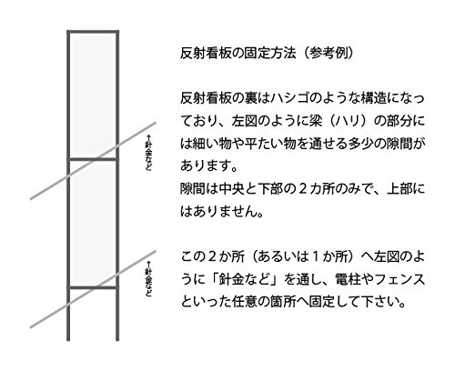 ●反射素材の特性により夜間でも抜群の認識力を発揮します。●名入れ対応なので、ご希望の自治体名や団体名などが入れられます。●基板とスチール枠は強力両面テープとビス(10カ所)でしっかり固定してあります。●総厚は約20ミリと、収納時もかさばりません。●針金(※別途ご用意下さい)等で電柱やフェンスに簡単に固定できます。●この商品は受注生産品です。●看板の基材となる鉄枠や鉄板には弊社へ入荷した時点で多少のスレやキズが生じている場合があります。尚、これにより反射看板の性能や用途を損なう事はありませんので多少のスレやキズは仕様とさせて頂いております。予めご了承下さい。●大変申し訳ありませんが、この商品は配送業者が定める配達不可地区(離島、沖縄県、配送車両の通行制限のある地域)、配達不可時期(主に北日本の冬期)においてはご注文頂けません。●配達の可否地区・時期について、ご不明点がありましたらプロテックへ直接お問い合わせ下さい。