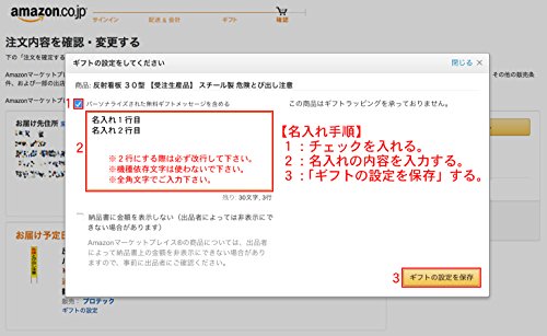 - 名入れの手順:商品をカートに入れる > 「レジに進む」をクリック > 「注文内容を確認・変更する」の画面にて「ギフトの設定」をクリック > 「パーソナライズされた無料ギフトメッセージを含める」にチェックを入れる > ギフトメッセージ欄に名入れの内容を入力 > ギフトの設定を保存 > 注文を確定する