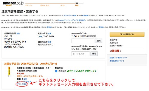 - 名入れの手順:商品をカートに入れる > 「レジに進む」をクリック > 「注文内容を確認・変更する」の画面にて「ギフトの設定」をクリック > 「パーソナライズされた無料ギフトメッセージを含める」にチェックを入れる > ギフトメッセージ欄に名入れの内容を入力 > ギフトの設定を保存 > 注文を確定する