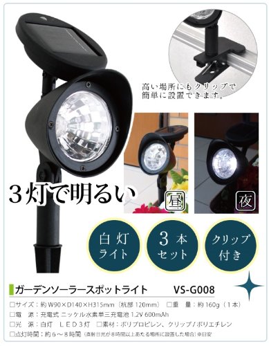 ●電源:充電式ニッケル水素単三充電池 1.2V 600mAh●光源:白灯 LED3灯●点灯時間:約6~8時間(直射日光が8時間以上あたる場所に設置した場合)※目安●商品サイズ / 重量:約W90×D140×H315mm (杭部120mm)/約160g(1本)■電池不要でとっても経済的!昼間に太陽光で充電して辺りが暗くなってきたら自動点灯!■どんな場所にも簡単設置地面に埋め込むだけで簡単に設置ができ、電気配線もいらないのでどんな場所でも簡単に設置できます。クリップ付きなので、高い場所への設置もらくらく。
